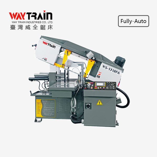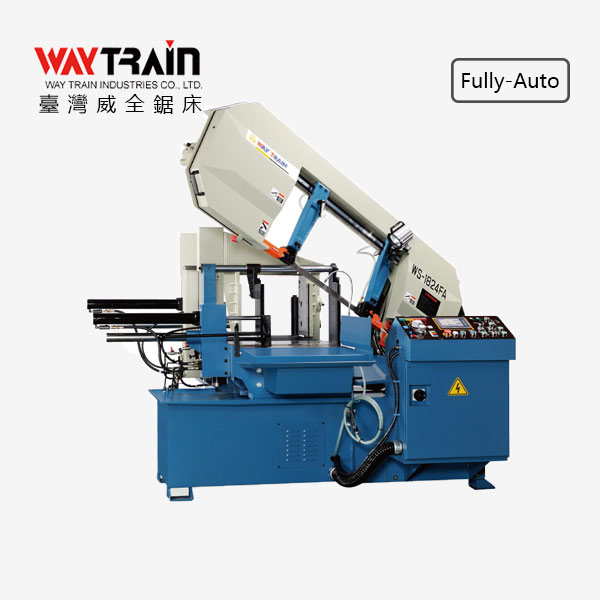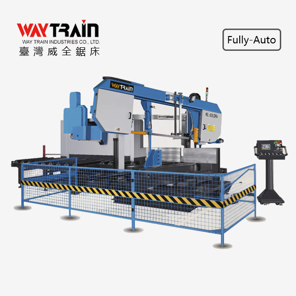 WL-650DSA角度鋸切帶鋸床左60°,右45°雙角度鋸切 油壓鎢鋼導塊夾緊裝置 油壓鋸帶張力裝置 動力鋼刷及鐵屑輸送 鋸帶變頻無段速度控制 鋸帶導臂會依據材料自動同步調整位置 操作熒幕設定角度鋸弓即自動旋轉